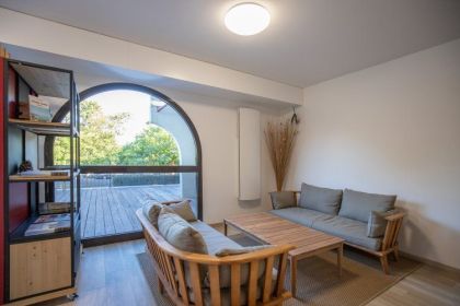 Auto - Autobahn A10 von Paris, A63 von Bordeaux und A64 von Toulouse. In Anglet angekommen, fahren Sie in Richtung "Plages" (Strände). Am Ufer des Adour folgen Sie Anglet-Océan bis zum Kreisverkehr der Capitainerie, dann "promenade de la Barre" Richtung Chiberta und 7. rechts, Avenue de la Forêt.